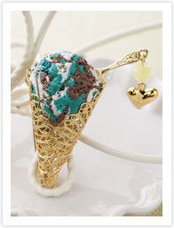 3色のマーブリングとドーム型の形成やひび割れの作り方を学びます。透かしパーツをコーンにみたてた今までにない新しい使い方と、アイスをおいしそうに盛り付けるテクニックも学べます。